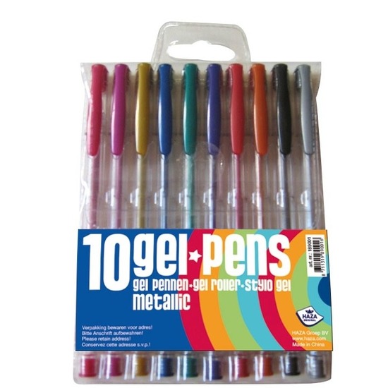 10 stuks metallic gekleurde gel pennen. Deze gelpennen zijn ideaal voor tekenen, versieren en schrijven. Zowel op licht als donker papier.