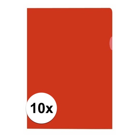 10x Insteekmap rood A4 formaat 21 x 30 cm. L-map van stevige kwaliteit transparant PP 120 mµ, generfde uitvoering, copysafe en antistatisch. De map is aan de boven- en rechterzijde open en is voorzien van een duimgreep. Kleur rood. A4 formaat. U ontvangt 10 mapjes.