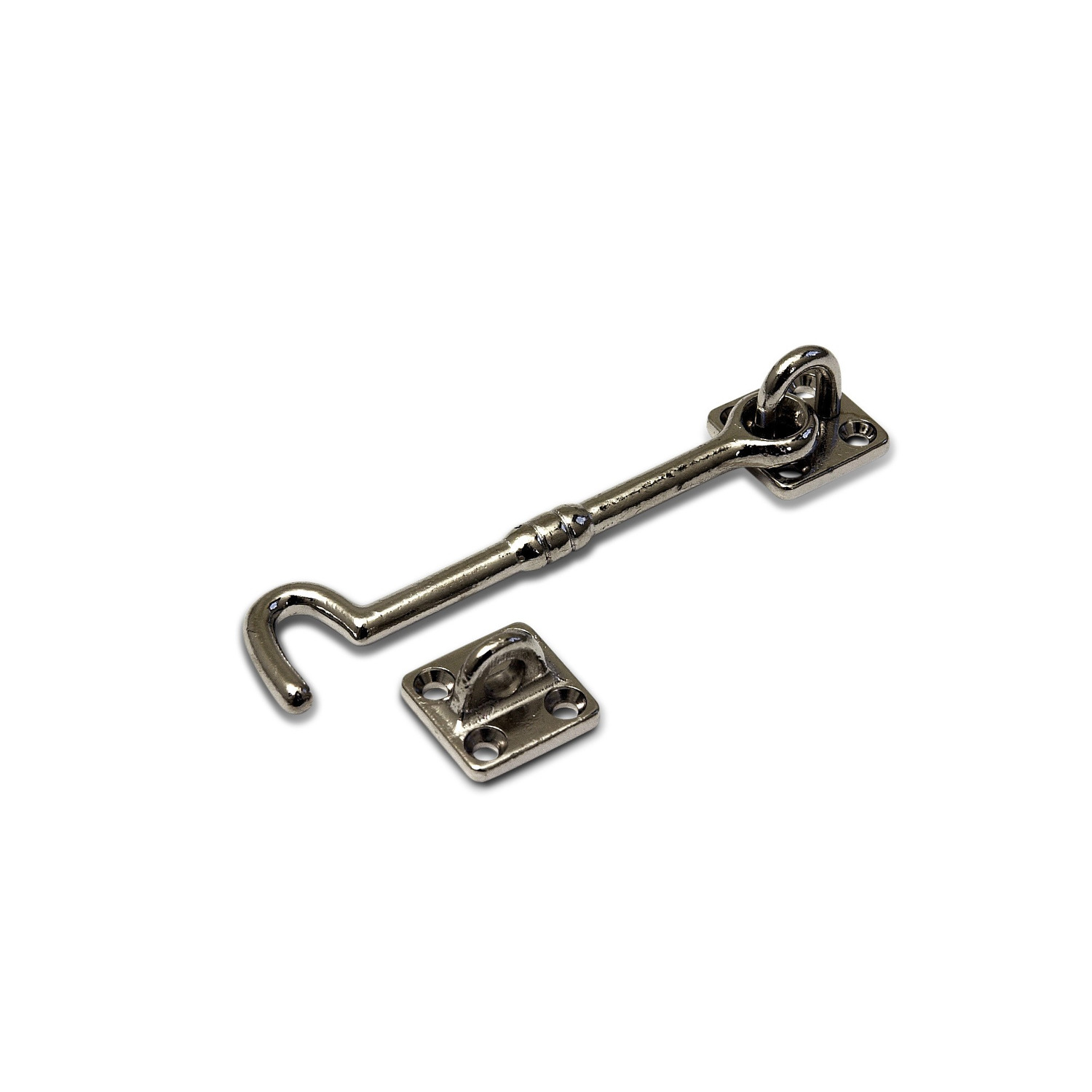 1x stuks kajuithaak / kajuithaken van vernikkeld messing met oog. Deze kajuithaak / bevestigingshaak heeft een lengte van 5 cm en een diameter van 0,4 cm. Voor bevestiging aan deuren om te voorkomen dat ze door sterke wind dicht- of openslaan. Ook handig om een raam of deur af te sluiten. Lengte: 50 mm / 5 cm. Materiaal: messing / vernikkeld.