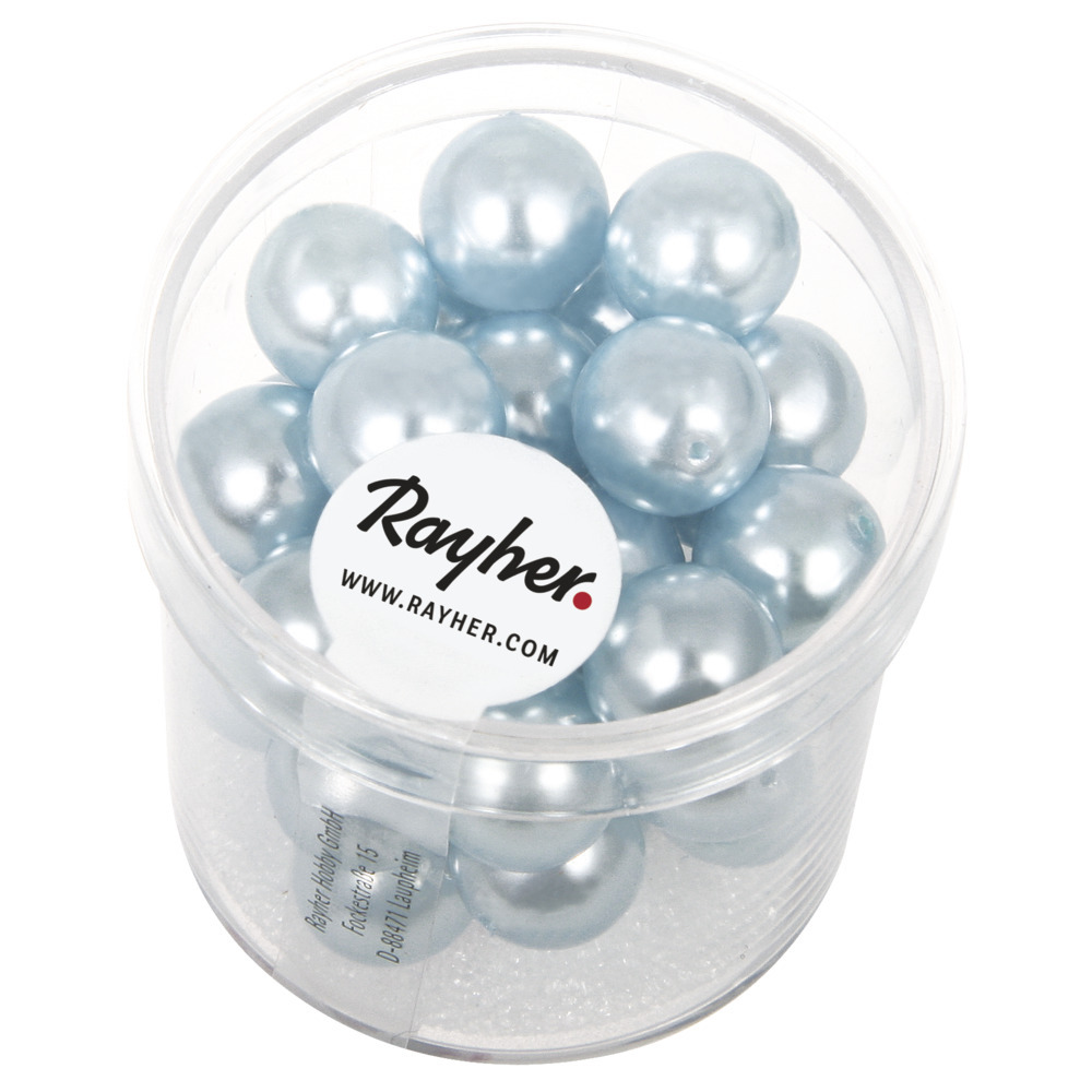 Lichtblauwe parel glaskralen 10 mm. Doosje met 35x Renaissance glasparels / glaskralen in licht blauwe kleur met parelmoerglans, om bijvoorbeeld zelf een ketting of sieraad mee te maken. De kralen hebben een diameter van 10 mm.