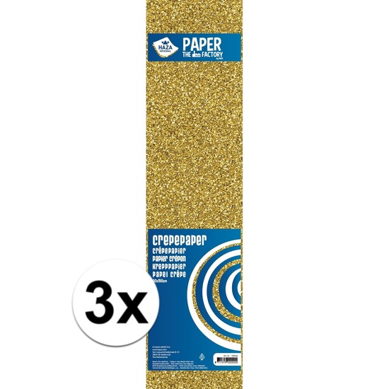 3x Crepe alu papier in de kleur goud met glitters. Een groot vel papier met een formaat van 150 x 50 cm. Dit knutsel papier zit opgevouwen in de verpakking. Formaat: 150 x 50 cm. Materiaal: 70 grams papier. Knutselspullen en hobby/knutsel materiaal. U ontvangt 3 vellen.