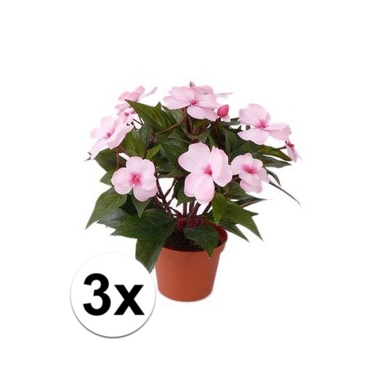 3x stuks kunstplanten met bloemen Nieuw-Guinea-Impatiens plantjes met 13 lichtroze bloemen. De kunstplanten van plastic/stof wordt geleverd met pot welke bevestigd zit aan het plantje. De pot heeft een diameter van 9,5 cm aan de bovenzijde en 6,5 cm aan de onderzijde.