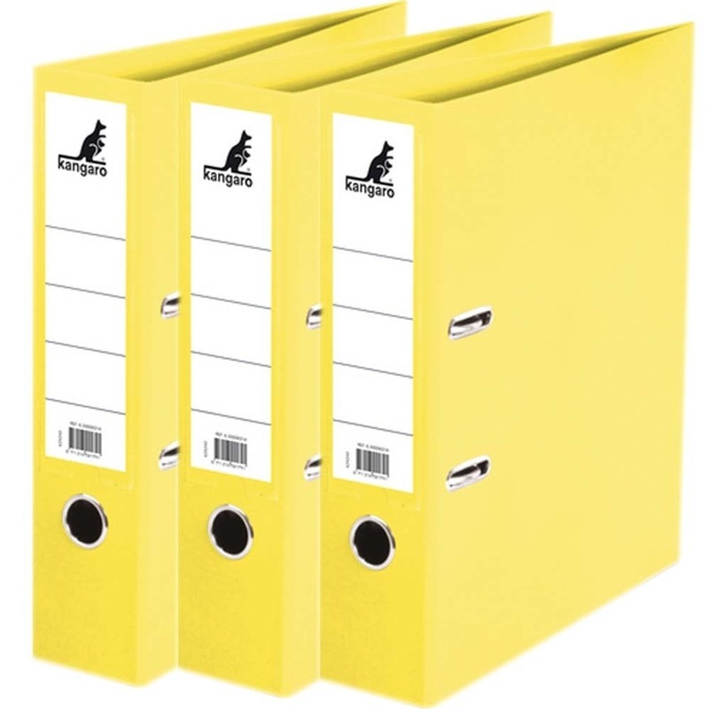 3x Ringband mappen/ordners geel 75 mm A4. Ringbandmap/ordnermap voor het opbergen van papieren/documenten/facturen in A4 formaat. De map is geheel omplakt met kunststof, waardoor deze vuil- en vochtafstotend is. Hefboommechaniek met drukspanner (2 U-ringen), een duimgat/grijpgat en een vervangbaar etikethouder. Formaat: 31,5 x 28,5 x 7,5 cm. Handige kantoorartikelen voor het opbergen van documenten zoals dossiers of facturen. U ontvangt 3 stuks.