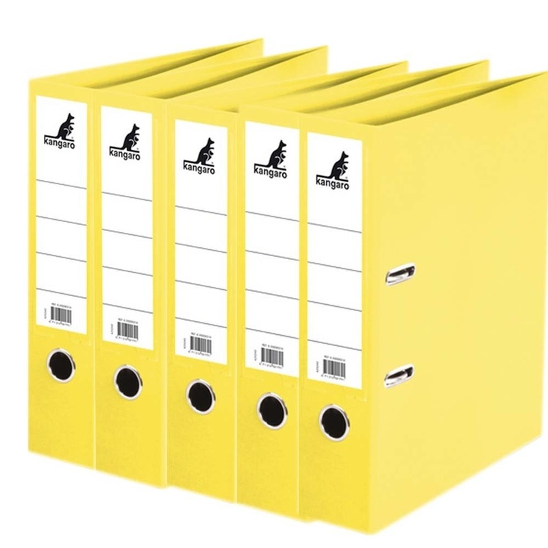5x Ringband mappen/ordners geel 75 mm A4. Ringbandmap/ordnermap voor het opbergen van papieren/documenten/facturen in A4 formaat. De map is geheel omplakt met kunststof, waardoor deze vuil- en vochtafstotend is. Hefboommechaniek met drukspanner (2 U-ringen), een duimgat/grijpgat en een vervangbaar etikethouder. Formaat: 31,5 x 28,5 x 7,5 cm. Handige kantoorartikelen voor het opbergen van documenten zoals dossiers of facturen. U ontvangt 5 stuks.