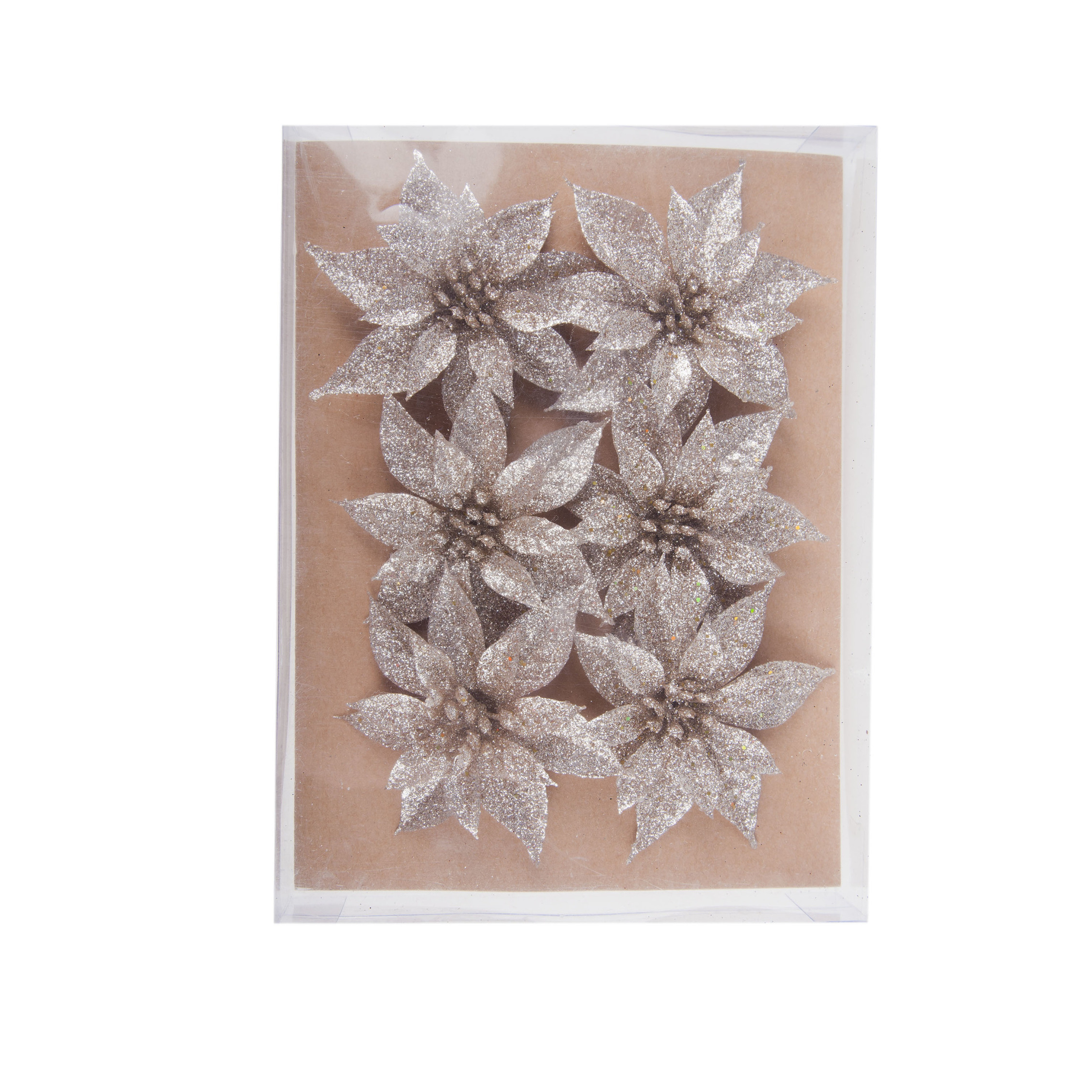6x stuks decoratie bloemen rozen champagne glitter op clip 8 cm. Deze bloemetjes/roosjes hebben een clip waardoor ze gemakkelijk bevestigd kunnen worden. Materiaal: kunststof.