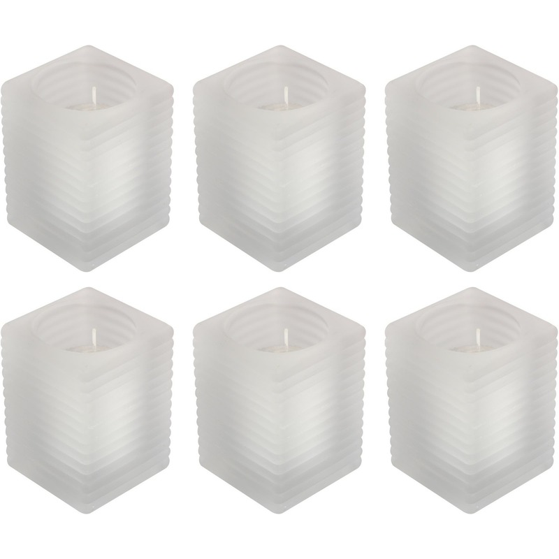 6x Matte glazen kaarsenhouders met kaars 7 x 10 cm 24 branduren. Vierkante matte/melkglas kaarsenhouders met kaars in wit in kunststof houder. U kunt een hervulling los bestellen in deze webshop onder referentie 8720147500707. Door de kunststof houder rond het kaarsje blijft de glazen houder waxvrij en is het kaarsje gemakkelijk te vervangen wanneer deze opgebrand is. Formaat: 5 x 5 x 9,8 cm. Diameter gat voor kaarsje: 7,2 cm. Aantal branduren: 24 uur. Materiaal: glas, wax/was, paraffine. Geurloze sfeerkaarsen in houder. Woondecoraties kaarsen versiering. Horeca tafeldecoratie kaarsen. U ontvangt 6 houders met ieder een kaars.