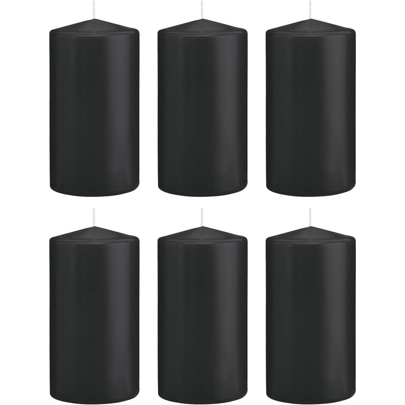 6x Zwarte cilinderkaarsen/stompkaarsen 8 x 15 cm 69 branduren. Rechte cilinderkaarsen/stompkaarsen zonder geur met gladde afwerking in de kleur zwart. U kunt meerdere kaarsen gebruiken als sfeermakers, bijvoorbeeld tezamen gepresenteerd op een kaarsenplateau.
