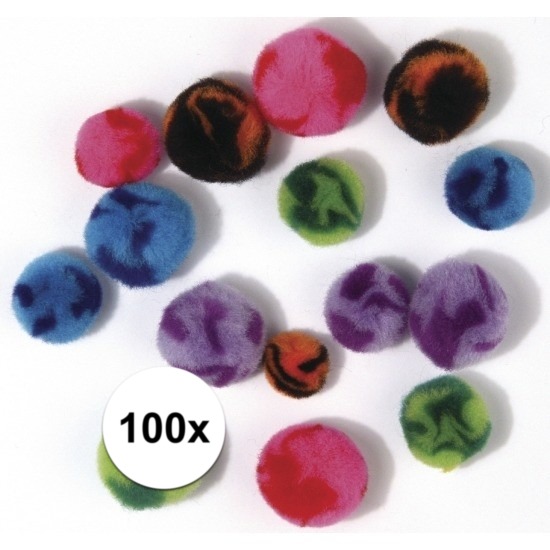 Zak met 100 stuks knutsel pompons in verschillende kleuren en maten. Deze hobby pompons kunt u gebruiken voor allerlei creaties, bijvoorbeeld pompon figuurtjes.