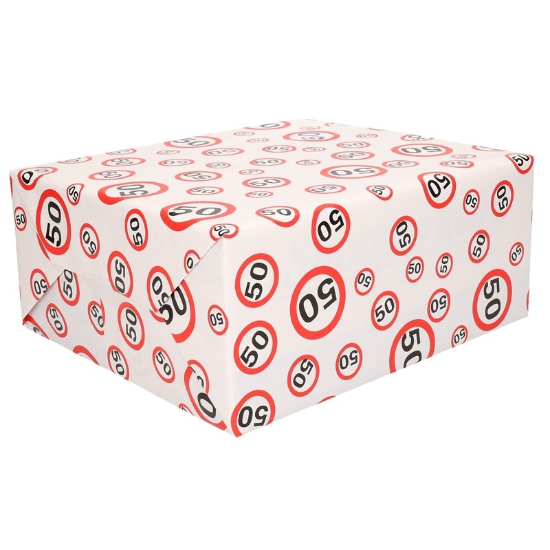 Inpakpapier 50 jaar met verkeersborden print. Formaat: 70 x 300 cm lang. Materiaal: papier. Inpakpapier / cadeaupapier / kadopapier.