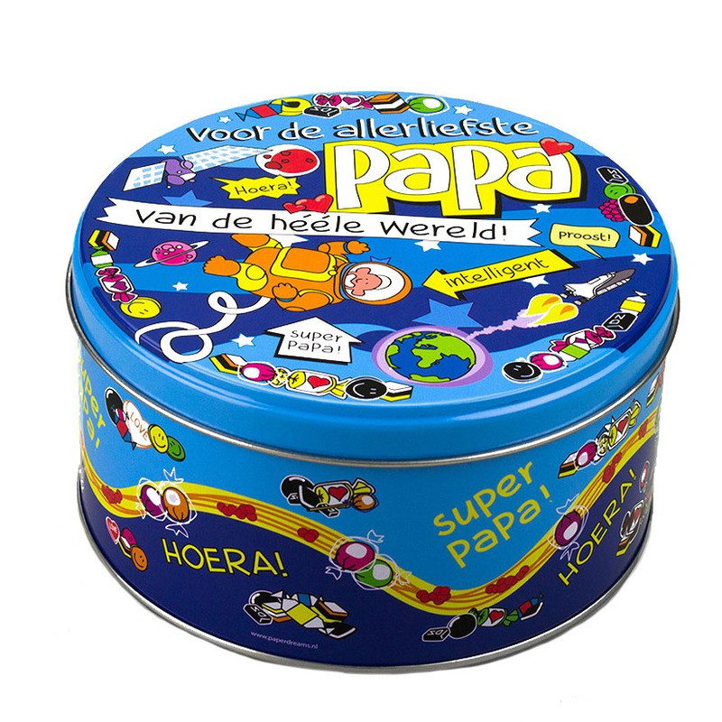 Snoeptrommel met boodschap: Voor de allerliefste Papa van de heƩle wereld! Snoeptrommel met spetterende kleuren.