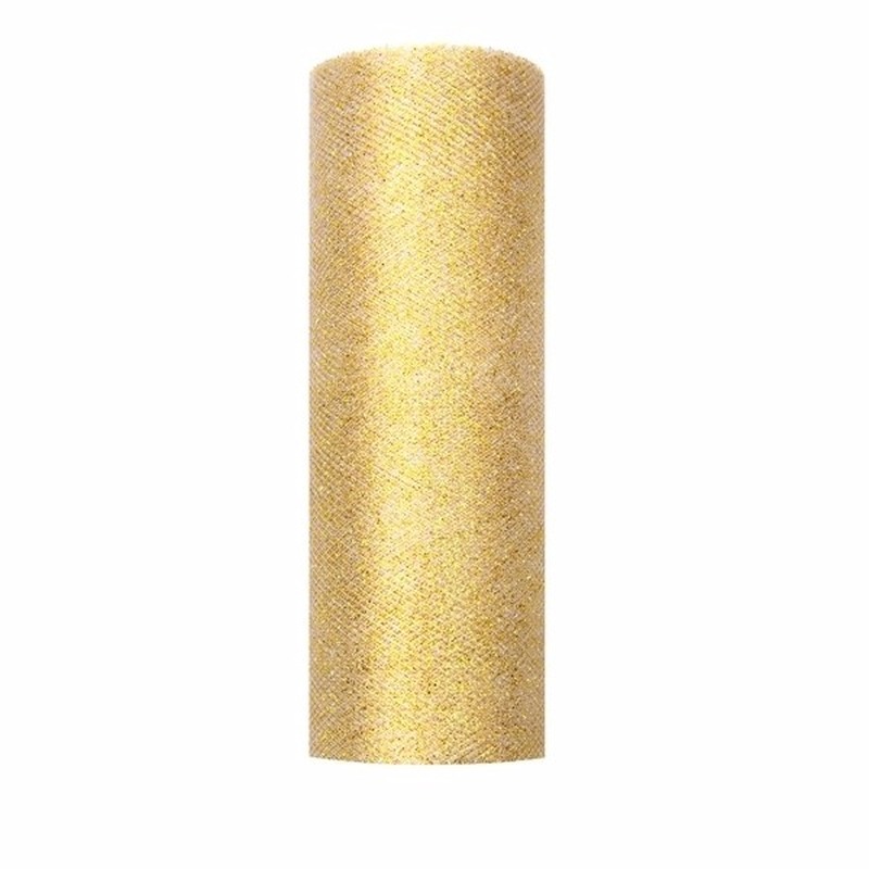 Glitter tule stof goud 15 cm breed. Rolletje gouden tule stof met glittertjes. Breedte: ongeveer 15 cm. Lengte: ongeveer 9 meter.
