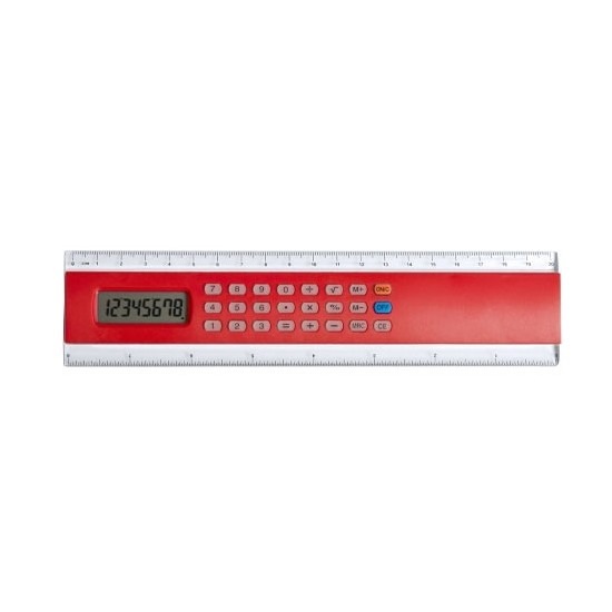 Rode liniaal 20 cm met rekenmachine. Een handige liniaal van ongeveer 20 cm met ingebouwde rekenmachine in de kleur rood. De liniaal werkt op 1 knoopcel batterij welke is inbegrepen. Met cm en inch aanduiding.