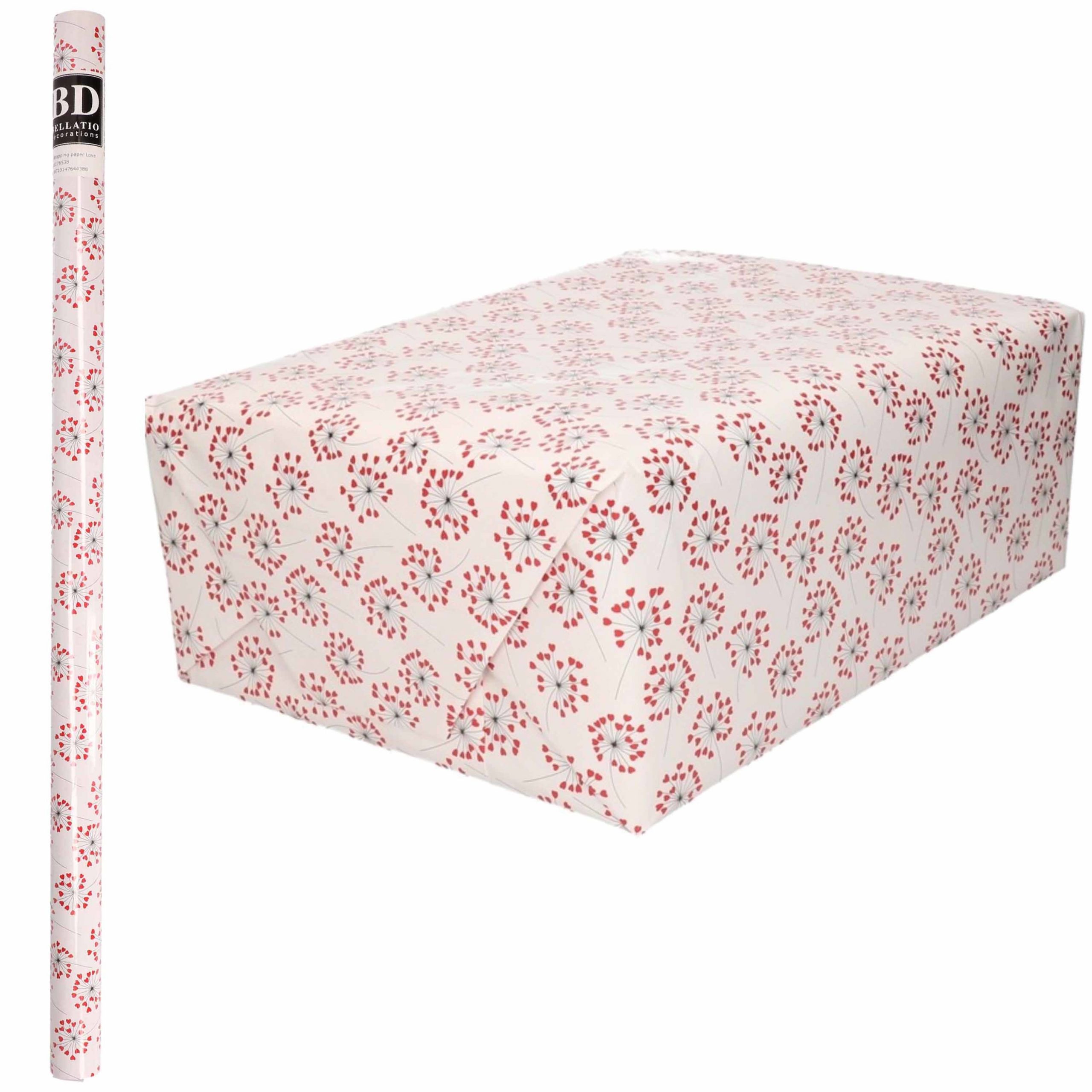 Inpakpapier/cadeaupapier met hartjes print 200 x 70 cm rol. Enkelzijdig bedrukt kadopapier met aan de ene zijde rode hartjes/bloemen print en aan de andere zijde unikleur wit. Valentijnsdag/verjaardag cadeauverpakking papier op rol. Materiaal: papier, 70 grams kwaliteit. Formaat: 200 x 70 cm, op rol. Type: Heart.
