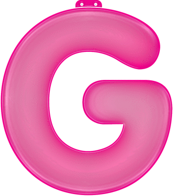 Roze opblaas letter G. Deze roze opblaasbare letter G is 35,5 cm groot. De letter heeft bovenaan gaatjes waardoor hij makkelijk op te hangen is. De letter is gemaakt van pvc plastic en is in alle letters en cijfers verkrijgbaar.