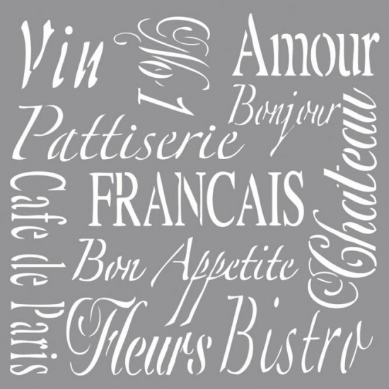 Franse teksten sjabloon. Sjabloon om mooie sierlijke Franse teksten te kunnen schilderen of tekenen. Het sjabloon heeft een formaat van ongeveer 30,5 x 30,5 cm en is gemaakt van polyester. Dit sjabloon is eenvoudig te reinigen en dubbelzijdig te gebruiken.