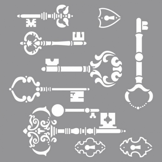 Sleutel sjabloon. Sjabloon om mooie sierlijke sleutels te kunnen schilderen of tekenen. Het sjabloon heeft een formaat van ongeveer 30,5 x 30,5 cm en is gemaakt van polyester. Dit sjabloon is eenvoudig te reinigen en dubbelzijdig te gebruiken.
