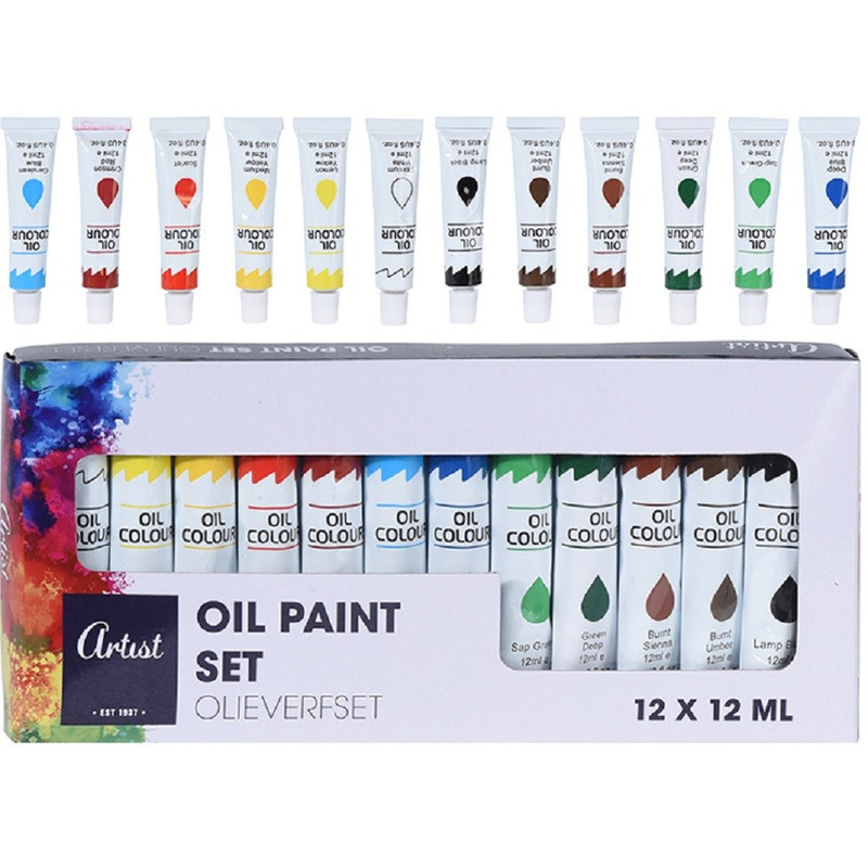 12 Verschillende kleuren olieverf, in tubes met een inhoud van 12 ml. Olieverf heeft een langere droogtijd en is geschikt voor o.a. papier, canvas, hout en aardewerk. De verf is niet op waterbasis en zeer geschikt om in verschillende hoogtes te schilderen. Hobby/knutselmateriaal schilderen met olieverf, 12 tubes.