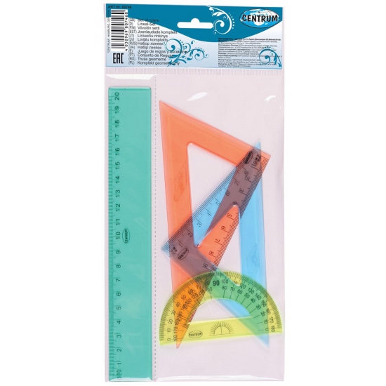 Linialen set 4 delig in etui. Dit setje bevat plastic meet hulpmiddelen in een handige etui bestaande uit: 1 liniaal 20 cm, 2 tekendriehoeken, en 1 gradenboog.