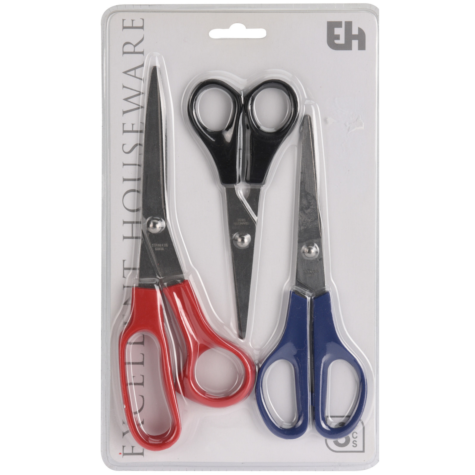 Set van 3x stuks scharen rood/blauw/zwart. Te gebruiken als stoffenschaar/textielschaar of als universele schaar voor het knippen van papier etc. De scharen zijn geschikt voor linkshandigen en rechtshandigen.