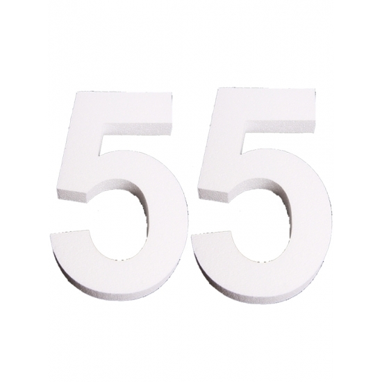 Piepschuim cijfer 55. Piepschuim cijfer 55 om bijvoorbeeld een leeftijd of jaartal mee te maken. De cijfers hebben een hoogte van ongeveer 25 cm en een dikte van 3 cm en zijn gemaakt met het lettertype Arial Bold. Het piepschuim is gemakkelijk te verven (waterbasis) of te lijmen met styropor lijm of oplosmiddelvrije lijm. Materiaal: styropor.