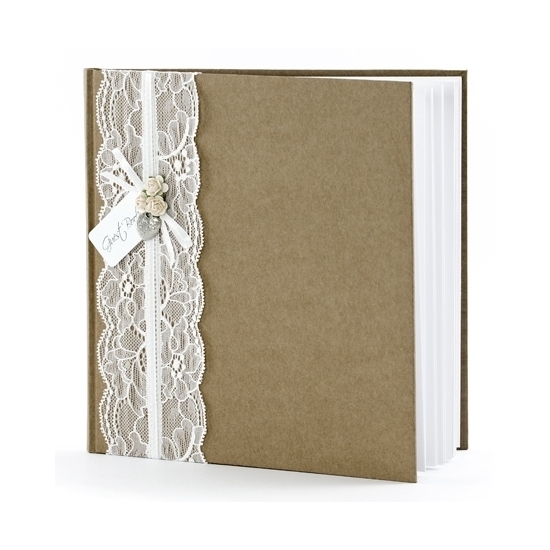Bruiloft gastenboek vintage 20,5 cm. Gebonden gastenboek in bruin papier met kant, lichtroze rozen, een hartvormige hanger en een inscriptie Guest Book. Formaat: 20,5 x 20,5 cm. Dit gastenboek heeft 22 bladzijden zonder tekst.