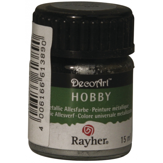 Zilveren acrylverf/allesverf potje 15 ml hobby/knutselmateriaal. Een klein potje zilveren acrylverf met een inhoud van ongeveer 15 ml. Een goed dekkende acrylverf die, naar wens, waterverdunbaar is. Des te minder water u toevoegt, des te dikker en dekkender de verf blijft. Geschikt voor bijna alle ondergronden. Ideaal om bijvoorbeeld piepschuim, hout, papier mache of plastic/kunststof mee te beschilderen. De verf heeft een matte finish.
